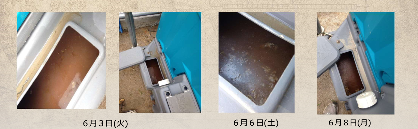 汚物が4分の1程度たまっている状態、 すでに臭いが出始めている状態、補給タンクと便槽に投入