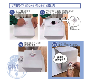 b.仮設トイレ・・・仮設トイレの給水タンクに投入してください。中和と分解のW消臭で嫌な臭いを中和し、臭い菌の活動を抑制します。また、排泄物が付着しにくいのでお掃除が簡単になります。(希釈倍率:5~6倍)