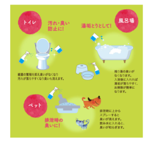 b.臭い防止・・・スプレーして布・タオル・紙などでふき取ってください。(希釈倍率:5~10倍)
