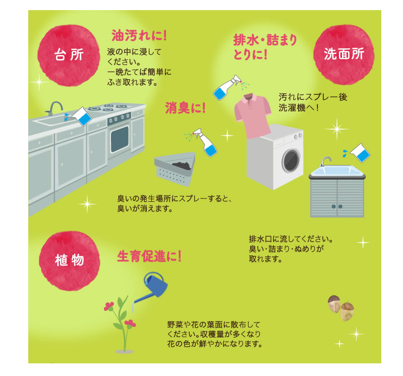 d.ディスポーザーの消臭・・・排水口に50~100㏄(コップ半杯程度)を流してください。詰まり・ぬめりも取れます。(希釈倍率:原液)